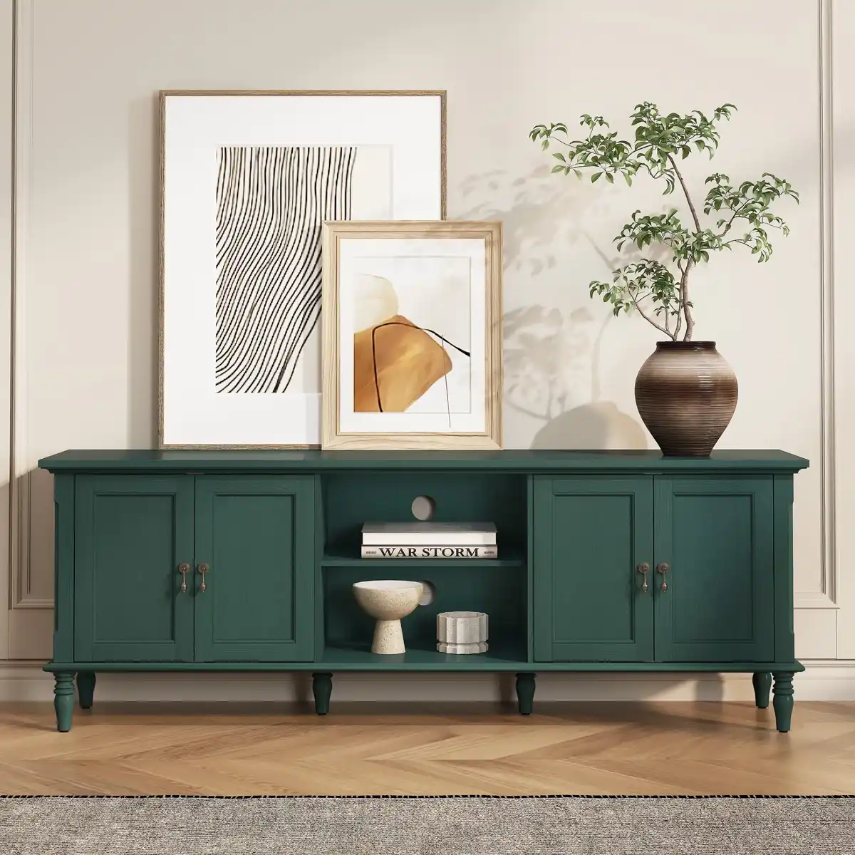 دارای کمدهای دربدار و فضای مرکزی برای دستگاههای دیجیتال، کنسول بازی و گیرندهها.